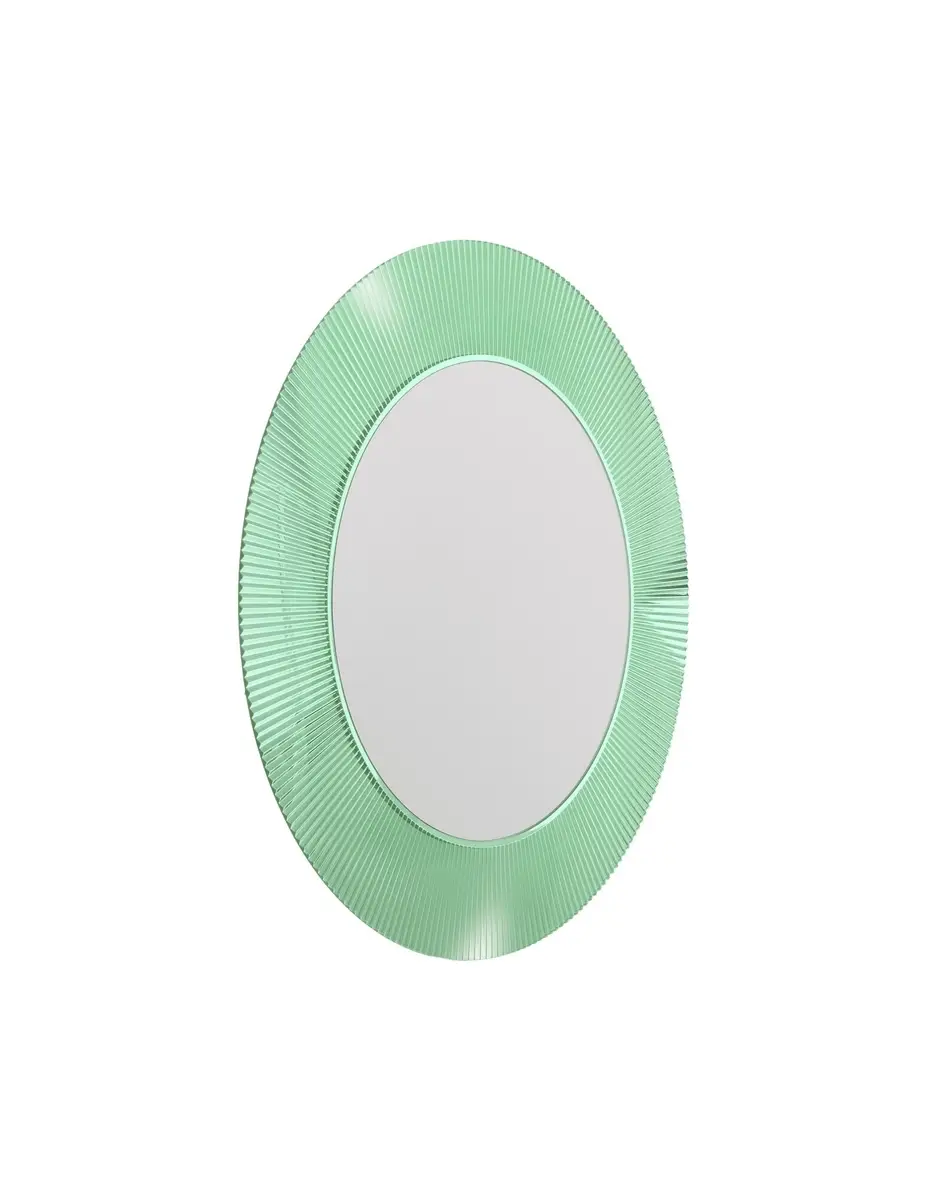 Specchio rotondo con una cornice trasparente o colorata, dal particolare effetto plissettato.