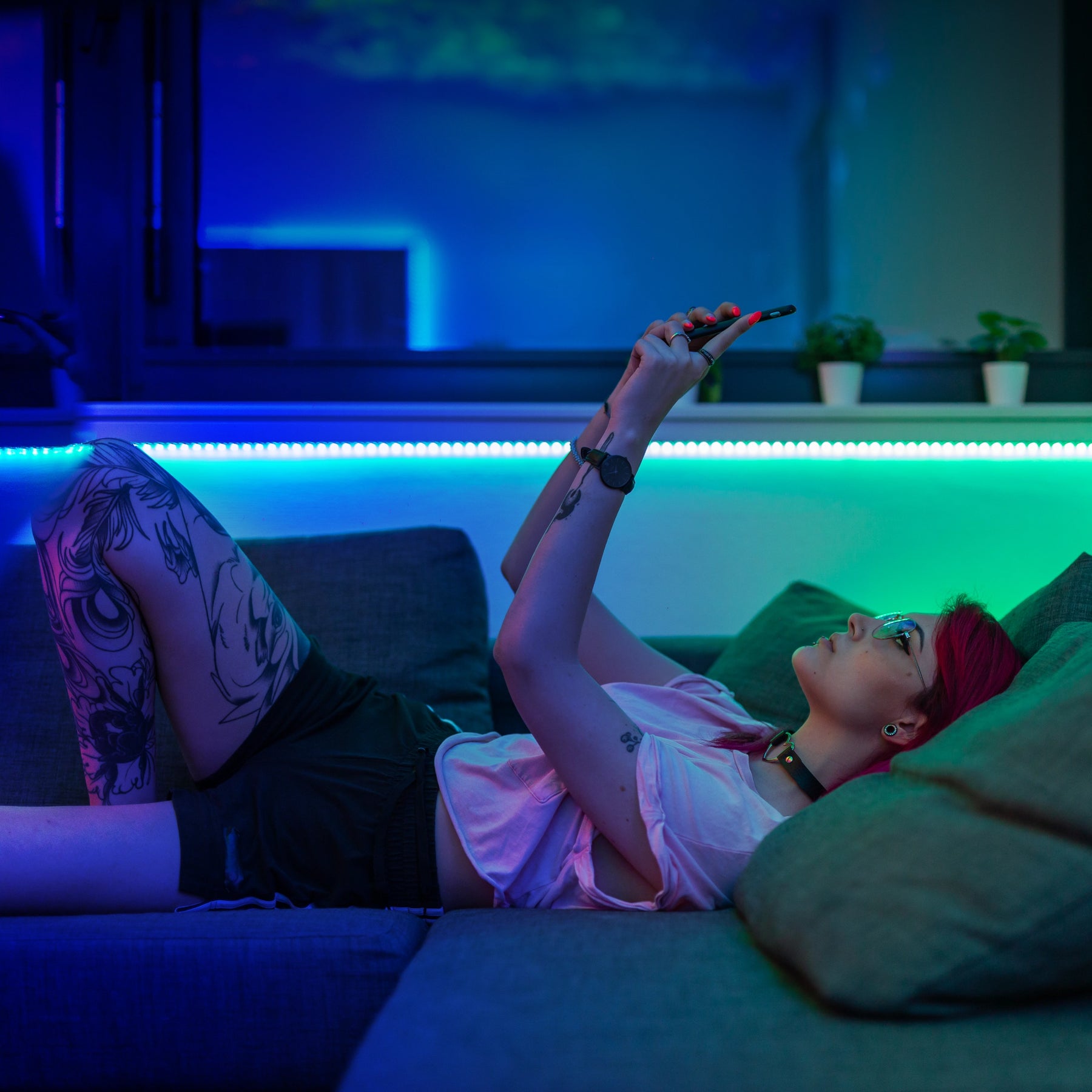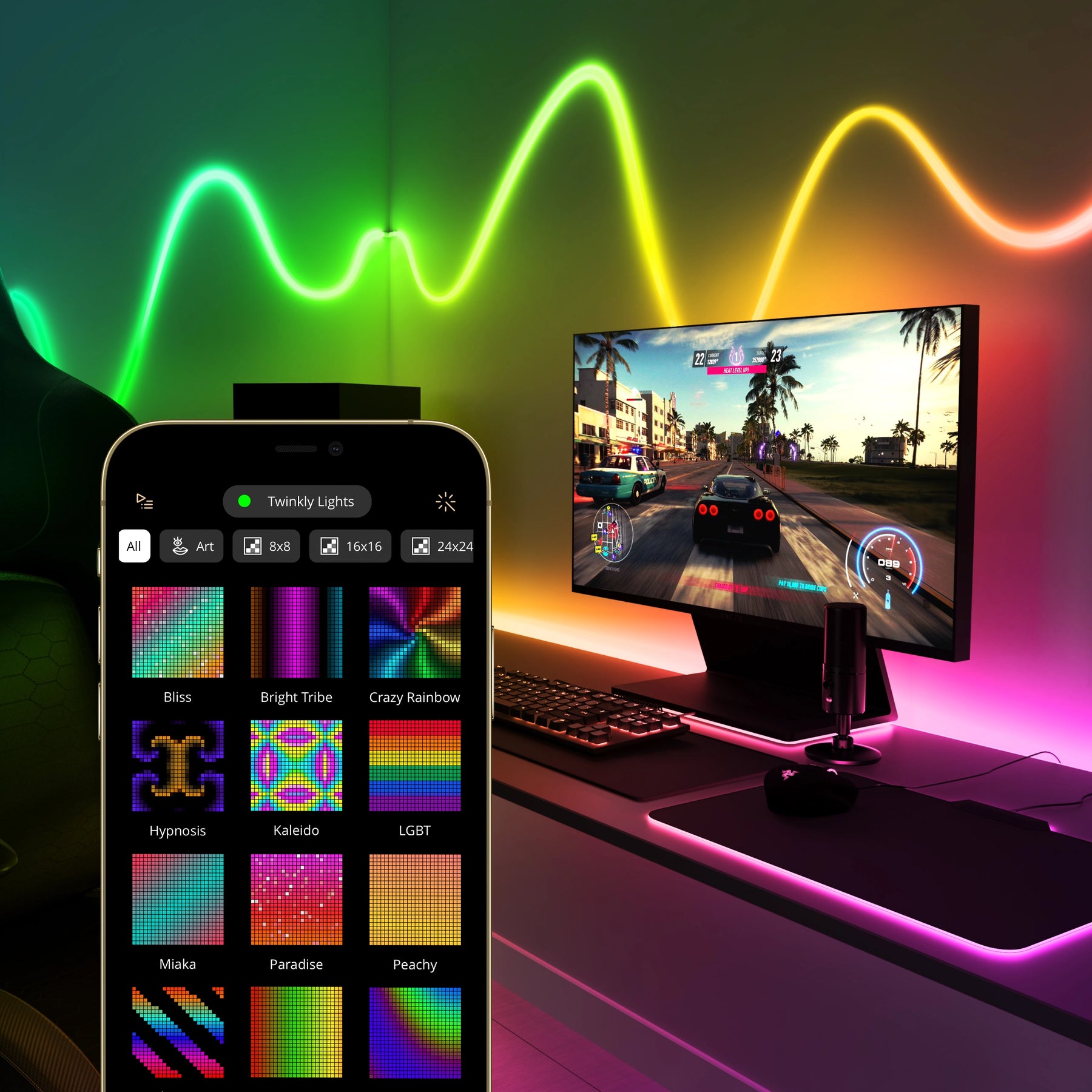 La striscia LED Twinkly Line aggiunge illuminazione creativa ad ogni ambiente adornando mobili, armadietti e scaffali per una retroilluminazione e dettagli luminosi stupefacenti. Dotati di supporto adesivo e magnetico, i LED di qualità controllati con app offrono luminosità eccezionale e 16 milioni di colori vivaci. Solo per interni.