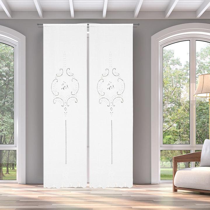 Tendina ricamata realizzata interamente in Italia con una minuziosa attenzione ai dettagli; porterà in ogni stanza lo spirito artigiano di un tempo.