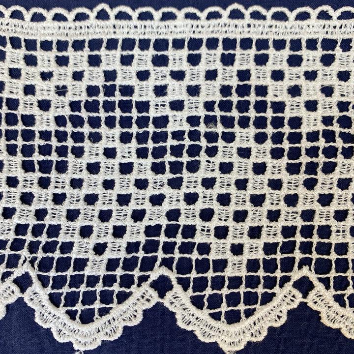 Il macramè è un merletto realizzato con filati intrecciati e annodati tra loro, senza l'aiuto di uncinetto. Pizzo orlato bianco con ricamo macramè perfetto per arricchire tovaglie, tende, asciugamani e lenzuola. Il prezzo indicato è al metro.