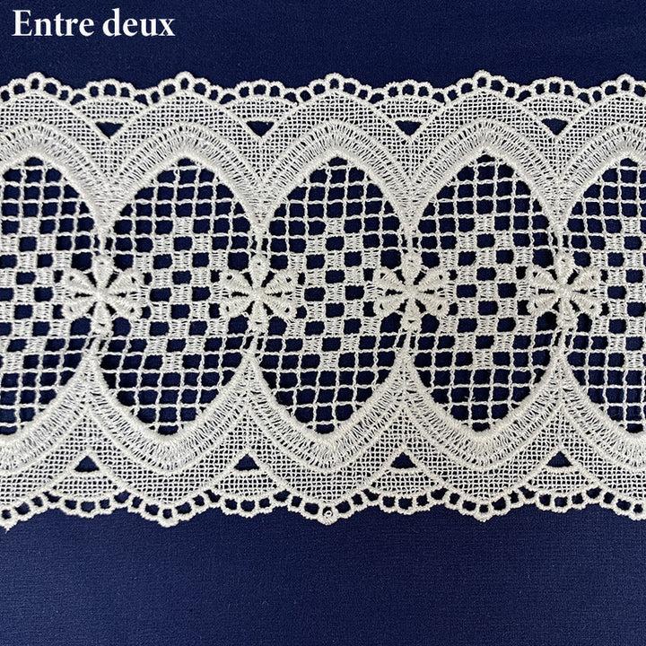Il macramè è un merletto realizzato con filati intrecciati e annodati tra loro, senza l'aiuto di uncinetto. Pizzo orlato bianco con ricamo macramè perfetto per arricchire tovaglie, tende, asciugamani e lenzuola. Il prezzo indicato è al metro.