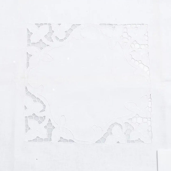 Set di coprimacchia con 4 tovaglioli coordinati, dedicato a coloro che amano l'esclusività e la perfezione data dai ricami realizzati completamente a mano su un tessuto di pregiato e morbido cotone.